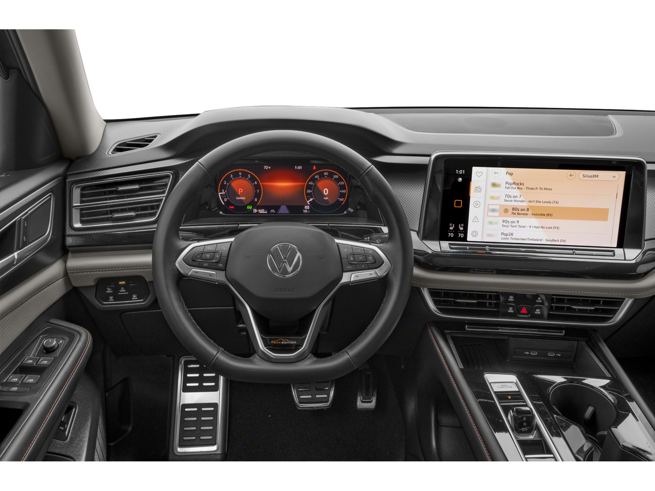 3rd row seats: split-bench, 4-Wheel Disc Brakes, 6 Speakers, ABS brakes, Active Cruise Control, Air Conditioning, Alloy wheels, AM/FM radio: SiriusXM with 360L, Auto High-beam Headlights, Auto-dimming Rear-View mirror, Automatic temperature control, Brake assist, Bumpers: body-color, Compass, Delay-off headlights, Driver door bin, Driver vanity mirror, Dual front impact airbags, Dual front side impact airbags, Electronic Stability Control, Emergency communication system: VW Car-Net Safe & Secure 5-year, Exterior Parking Camera Rear, Four wheel independent suspension, Four-wheel Independent Suspension, Front anti-roll bar, Front Bucket Seats, Front Center Armrest, Front dual zone A/C, Front fog lights, Front reading lights, Fully automatic headlights, Garage door transmitter: HomeLink Connect, Heated & Actively Ventilated Front Bucket Seats, Heated door mirrors, Heated front seats, Heated steering wheel, Illuminated entry, Low tire pressure warning, Occupant sensing airbag, Outside temperature display, Overhead airbag, Overhead console, Panic alarm, Passenger door bin, Passenger vanity mirror, Perforated V-Tex Leatherette Seating Surfaces, Power door mirrors, Power driver seat, Power Liftgate, Power moonroof: Panoramic, Power steering, Power windows, Radio data system, Radio: MIB3 Composition Media, Rain sensing wipers, Rear air conditioning, Rear anti-roll bar, Rear reading lights, Rear seat center armrest, Rear window defroster, Remote keyless entry, Security system, Speed control, Speed-sensing steering, Split folding rear seat, Spoiler, Steering wheel mounted audio controls, Tachometer, Telescoping steering wheel, Tilt steering wheel, Traction control, Trip computer, Turn signal indicator mirrors, Variably intermittent wipers, Ventilated front seats, Wheels: 18 Black Painted 5-Spoke Alloy.